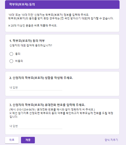 *미성년자의 경우 학부모 동의서를 별도로 체크 후 제출해야 합니다. 학부모 동의가 없으면 참가가 어려우니 해당되는 분들은 체크하시면 됩니다. 20대 이상인 경우에는 하단에 제출 버튼을 바로 누르면 됩니다.