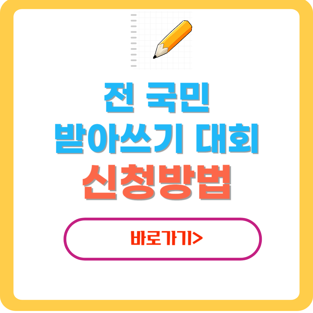 전 국민 받아쓰기 대회 신청은 대회 누리집 접속 후 신청서를 작성 후 신청할 수 있습니다. 전 국민 받아쓰기 대회 8월 12일(월)부터 신청기간은 8월 25일(일)까지입니다. 신청을 원하시는 분들은 일정 놓치지 마시고 바로 신청하시면 되겠습니다.