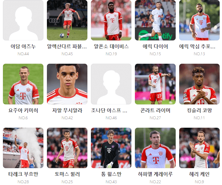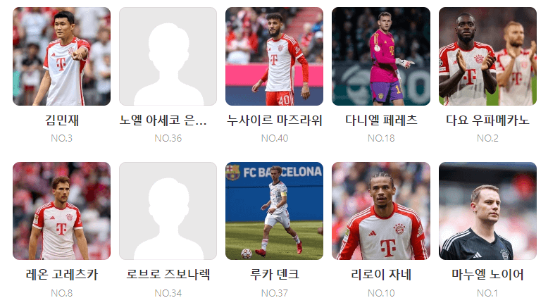 - 수비수 : 김민재, 마즈라위, 우파메커노, 덴크, 빈뢰프, 더 리흐트, 숄체, 사르, 사샤 보이, 아즈누, 데이비스, 다이어, 게레이루